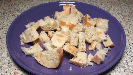 Zwiebeln abziehen und in Streifen schneiden. Das Brot in kleine Stücke schneiden. Die Klöpfer schälen und der Länge nach halbieren und dann in ca. 1cm breite Scheiben schneiden.