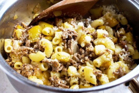 ca. 5-6 Minuten auf den Herd warm halten. So kann der Geschmack vom Gehackten in die Hörnli einziehen. Dann mit geriebenem Parmesan servieren.